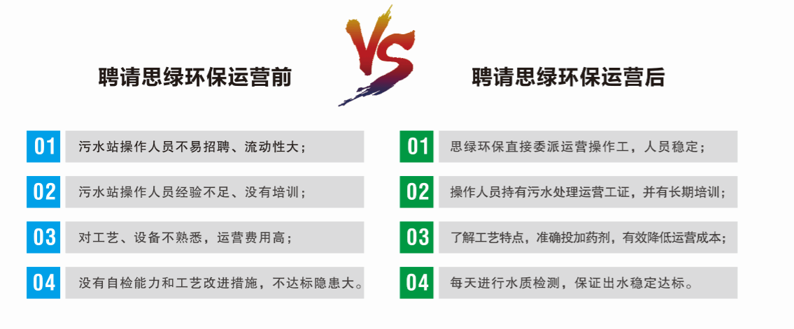 透過這些對比可以明顯看出:專業(yè)與非專業(yè)的污水處理運營模式,對污水處理站的運營效果造成的差距還是比較大的。還有一個最重要的隱藏優(yōu)勢:污水處理站出現(xiàn)的任何環(huán)保問題,將直接由我公司全權(quán)負責。